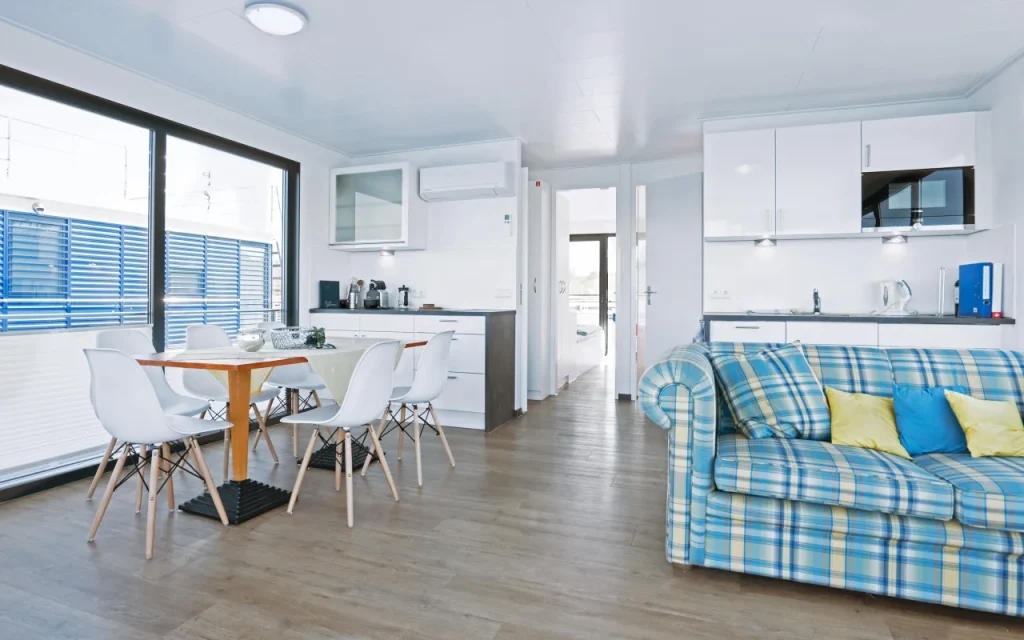 Unsere schwimmenden Unterkünfte sind mit allem ausgestattet, was Sie für einen komfortablen Aufenthalt benötigen. Genießen Sie modernen Luxus, eine gut ausgestattete Küche, geräumige Schlafzimmer und gemütliche Wohnbereiche.